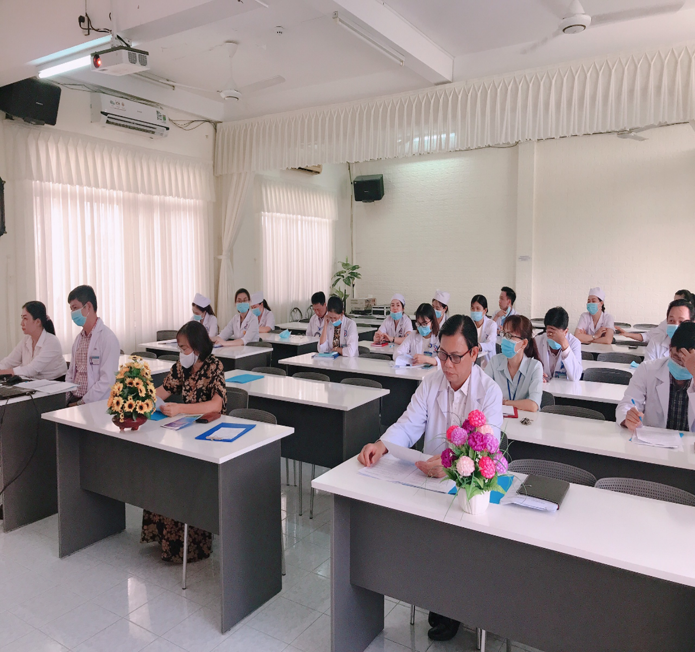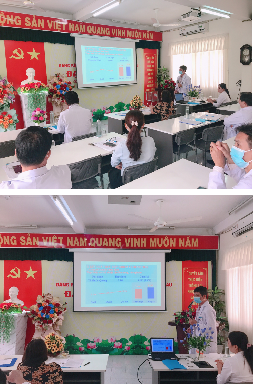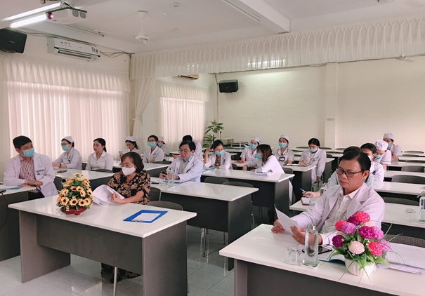 Chủ trì hội nghị có BSCKII. Trần Thị Bạch Như - Bí thư Đảng ủy, Giám đốc Bệnh viện; BSCKI. Trần Quang Sáng - Phó Bí thư Đảng ủy, Phó Giám đốc Bệnh viện; BSCKI Lê Văn Trò – Trưởng Phòng TCHC; BS. Nguyễn Hoàng Phong – Trưởng phòng KHTH, Chủ tịch Công Đoàn; BSCKI. Nguyễn Thị Xuân Chúc – P.Trưởng phòng KHTH, cùng với trưởng, phó các khoa/phòng, điều dưỡng trưởng và bác sĩ tham dự.