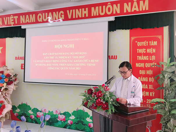Chiều ngày 23/10/2023, Bệnh viện Đa khoa thành phố Cà Mau tổ chức hội nghị Sơ kết công tác xây dựng Đảng, công đoàn và công tác bệnh viện 9 tháng đầu năm 2023 và triển khai nhiệm vụ trọng tâm quí IV năm 2023.